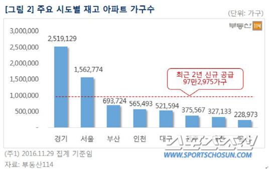 2년간 신규 공급된 97만2975가구는 2016년 11월 현재 전국 재고 아파트 948만2809가구의 10.3%, 10분의 1에 달한다. 100만가구라는 물량은 시도별 재고 아파트 가구 수와 비교하면 경기(251만9129가구)와 서울(159만2774가구)을 제외한 15개 시도의 재고 아파트 가구 수를 웃돈다. 부산 69만3724가구에 비하면 1.4배, 인천(56만5493가구)과 대구(52만1594가구)에 비교하면 2배 가량 많은 수준이다.