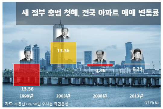 그러나 집값은 정부의 정책기조와는 전혀 다른 방향으로 흘러갔다. 정권 첫해에 김대중 정부나 이명박 정부, 박근혜 정부는 부동산 규제 완화를 통해 주택시장 정상화를 꾀했지만 정작 집값은 모두 하락했다. 1998년 김대중 정부 1년간 집값은 13.56% 하락했고 이명박 정부의 2008년에는 1.46%, 2013년 박근혜 정부 첫해에는 0.29% 각각 떨어졌다. 반면 강력한 부동산 규제 정책을 통해 집값 폭등을 잡으려 했던 노무현 정부 첫해인 2003년에는 오히려 집값이 13.36%로 두 자리 수 이상의 가격 상승이 나타났다.
