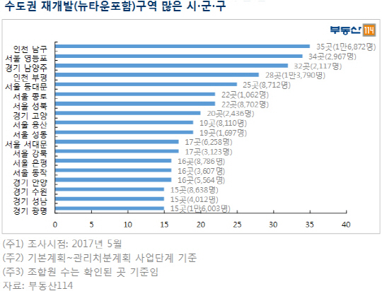 뒤이어 ▲인천 부평(28곳) ▲서울 동대문(25곳) ▲서울 종로(22곳) ▲서울 성북(22곳) ▲경기 고양(20곳) ▲서울 용산(19곳) ▲서울 성동(19곳) ▲서울 서대문(17곳) ▲서울 강북(17곳) ▲서울 은평(16곳) ▲서울 동작(16곳) ▲경기 안양(16곳) ▲경기 수원(15곳) ▲경기 성남(15곳) ▲경기 광명(15곳) 순으로 재개발·뉴타운 구역이 많았다.