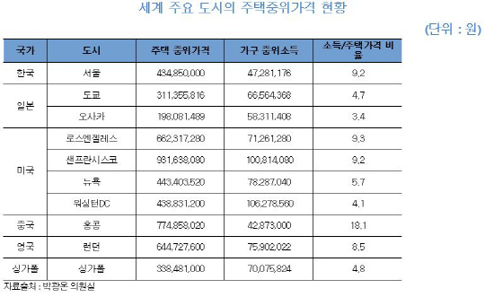 서울 주택 중위가격은 일본의 도쿄(3억1135만원)과 오사카(1억9808만원)보다 각각 1억2300만원, 2억3676만원 높았으며, 미국 워싱턴DC(4억3883만원), 뉴욕(4억4340만원)과 비슷한 수준인 것으로 분석됐다.