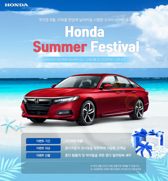이와 함께 혼다코리아는 8월 내 공식 전시장을 방문해 시승하는 고객들에게 혼다 텀블러 및 동반 자녀를 위한 컬러링북 세트를 증정하는 이벤트를 진행한다.