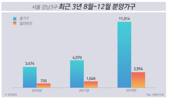 부동산인포에 따르면 연말까지 강남3구에서 총 2594가구가 일반분양될 전망이다. 작년 동기(1048가구)의 약 2.5배 많은 수준이다.
