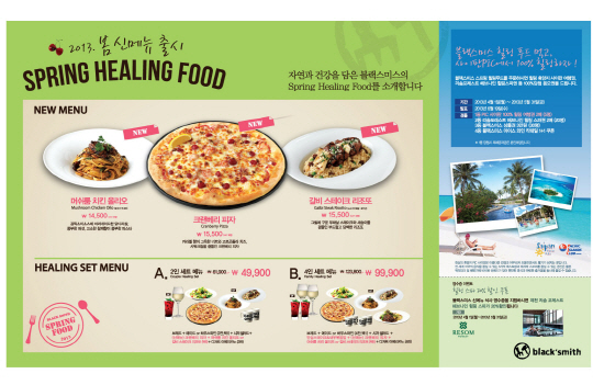블랙스미스는 이번 고객 사은 힐링 이벤트와 함께 신 메뉴로 구성된 힐링 세트를 두 달간 정상가보다 20% 저렴한 가격으로 특별 제공한다. 2인 세트(VAT포함 4만9천원)는 식전 빵, 에이드 또는 하우스와인 2잔, 시저 샐러드, 크랜베리 피자, 그리고 머쉬룸 치킨 올리오와 갈비 스테이크 리조또 중 한가지 선택과 함께 아메리카노 2잔으로 구성이 되었으며, 4인 세트(VAT포함 9만9천9백원)는 2인 세트에 안심스테이크&새우볶음밥과 음료가 각 2잔씩 추가된다.