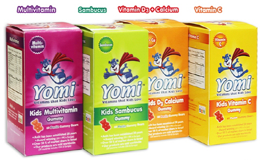 '요미'는 성분에 따라 멀티비타민, 삼부커스, 비타민D3칼슘, 비타민C 4가지로 나눠져 있으며, 곰돌이 모양 구미타입으로 물 없이 간단하게 간식처럼 씹어먹는 츄어블 비타민이다. 특히 동물의 부자재로 만든 '젤라틴' 원료가 아닌 식물성 천연원료인 감귤 펙틴을 사용해 어린이들이 안심하고 섭취할 수 있도록 했다.