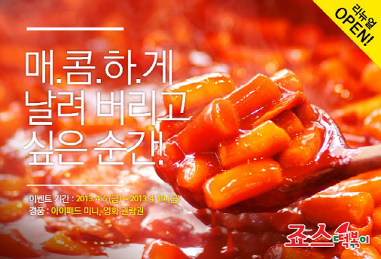 죠스떡볶이 홈페이지 리뉴얼 오픈 기념 사연 응모 이벤트 '매콤하게 날려 버리고 싶은 순간'은 오는 19일까지 진행된다. 새로운 죠스떡볶이 홈페이지 이벤트 페이지 댓글란에 '매콤하게 날려버리고 싶은 순간'이라는 주제로 회사, 학교, 가정 등에서 겪었던 힘들었던 순간의 사연을 남기면 된다. 응모된 사연 중 추첨을 통해 1명에게 아이패드미니, 20명에게 최신 영화 '뷰티풀 크리처스' 영화 예매권(1인 2매)을 증정한다. 당첨자 발표는 22일 죠스떡볶이 홈페이지 공지사항 및 당첨자 개별 메일을 통해 공지 될 예정이다.