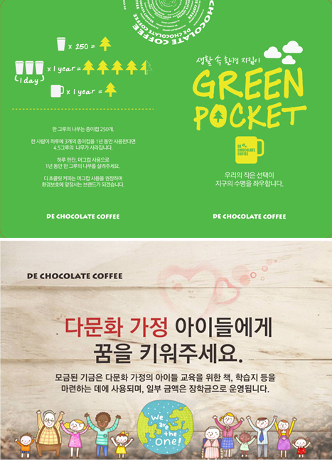 디초콜릿커피가 지속적으로 운영해온 다문화가정 모금캠페인과 환경보호캠페인인 그린포켓의 공통점은 바로 머그잔 사용이라는 점. 매장에서 머그잔을 사용하면 잔당 50원, 그리고 팝 아트 작가의 작품이 담긴 아트머그를 출시하여 판매수익의 일부를 다문화 가정에 기부하는 '다문화가정 모금캠페인'은 어려운 환경의 이웃에게 사랑 나눔과 동시에 머그잔 사용을 권장하는 환경보호활동으로 이어져 큰 이슈가 된 캠페인이다.
