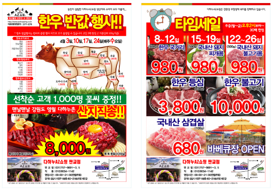 AZ쇼핑 판교점에서는 월요일부터 금요일까지 오후 2시부터 한우 국거리(400g)와 국내산 돼지 찌개·불고기용(각500g) 품목을 각각 980원에 판매하며 동탄점에서는 매주 월요일과 화요일, 9시부터 14시까지 한우 불고기(100g)를 1,580원에, 국내산 돼지 전지(100g)를 540원에 제공한다.