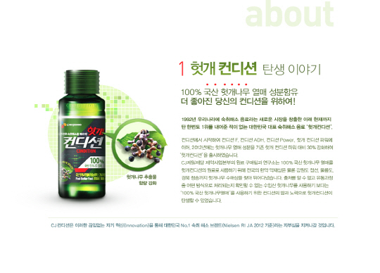 CJ제일제당은 헛개나무의 숙취해소 효과를 마케팅에 적극 이용하고 있지만 건강기능식품으로 등록하지는 않았다. 1992년 '컨디션'이 출시된 이래 1999년 '컨디션F', 2004년 '컨디션 ADH', 2007년 '컨디션파워', 2009년 '헛개 컨디션 파워', 지난해 '헛개 컨디션'으로 발전됐다. 최근 헛개 기능 강화가 도드라져 보인다.