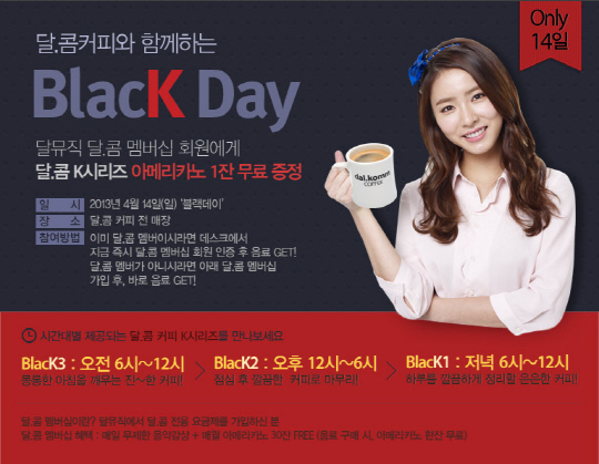 다날엔터테인먼트 최바다 실장은 "블랙데이를 맞이해 달뮤직 회원들을 위한 깜짝 이벤트를 준비했다"며 "이번 블랙데이에는 커플과 솔로 모두 맛있는 아메리카노 한잔과 함께 달콤한 음악을 즐기길 바란다"고 말했다.