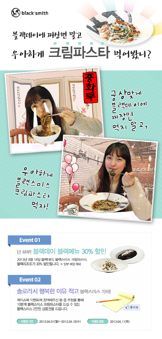 이번 행사는 블랙데이인 4월 14일 블랙스미스 매장을 방문하여 메뉴 이름에 '블랙'이 들어간 메뉴를 주문하면 무조건 30% 할인을 해주는 유쾌한 프로모션으로 대상 메뉴는 '블랙스미스 크림 파스타'와 '블랙 리조또'이다.