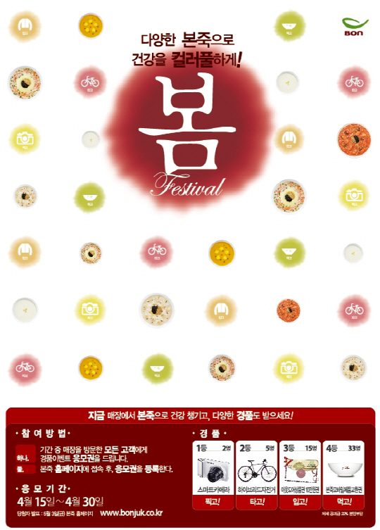 웰빙죽 전문점 '본죽'(대표 김철호, www.bonif.co.kr)이 봄기운이 완연한 4월을 맞이해 봄맞이 경품 이벤트를 실시한다고 11일 밝혔다.