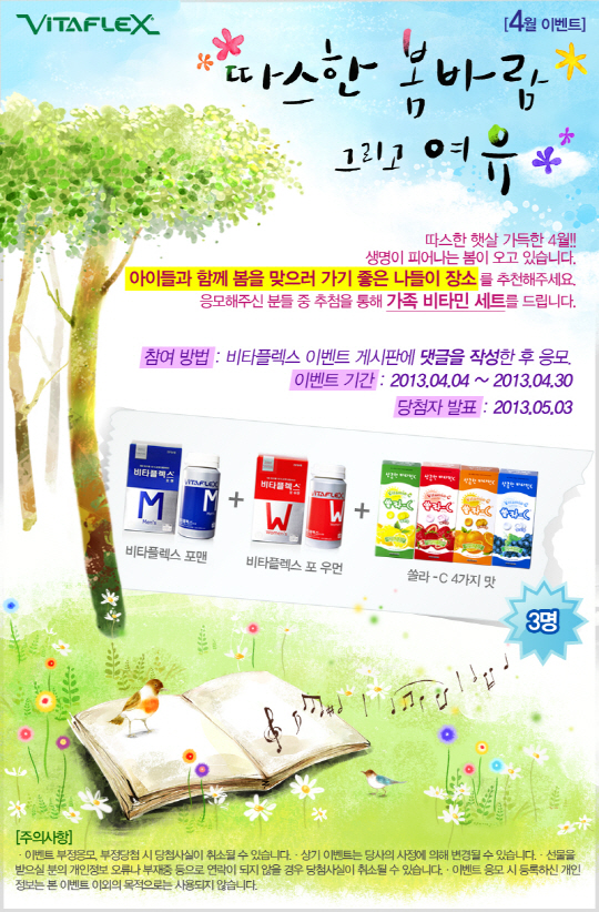 이벤트에 참여하려면 비타플렉스 홈페이지(www.vitaflex.co.kr) 이벤트란에 접속, 따뜻한 봄날 4월을 맞아 어린이와 함께 놀러 가기 좋은 추천 장소를 작성하여 올리면 된다. 응모자 중 추첨을 통해 3명에게 비타플렉스 (비타플렉스 포맨·비타플렉스 포우먼) 세트와 쏠라씨 4가지 맛을(레몬·딸기·오렌지·포도) 선물로 증정한다.