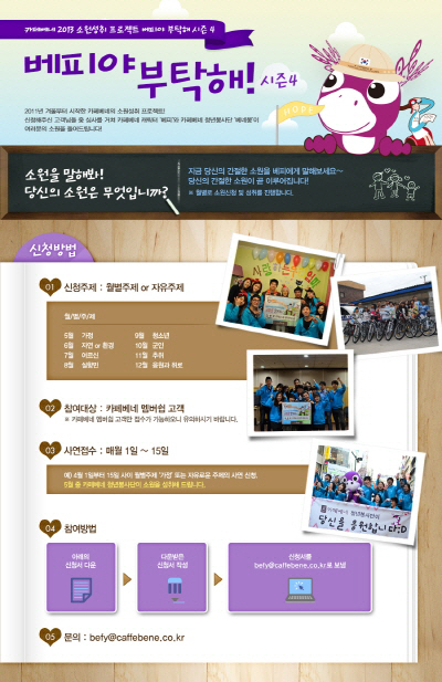 3회째를 맞는 '베피야 부탁해'는 고객의 소원을 접수 받아 카페베네 캐릭터 '베피'와 청년봉사단 '베네봉'이 직접, 그들의 소원을 이뤄주는 연중 캠페인이다. 자유주제와 함께 매월 환경·청소년·군인 등 특정 주제를 하나 더 선정해 이와 관련된 소원을 접수 받을 계획이다.