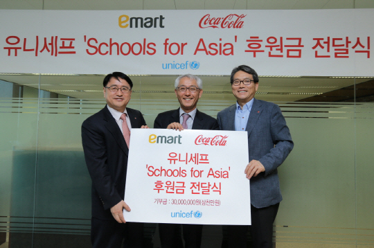 이마트, 코카-콜라 음료, 유니세프 한국위원회는 지난 30일 이마트 본사에서 유니세프의 'Schools for Asia(아시아에 희망의 학교를 선물하세요)' 프로그램에 3천만 원을 기부하는 전달식을 진행했다.