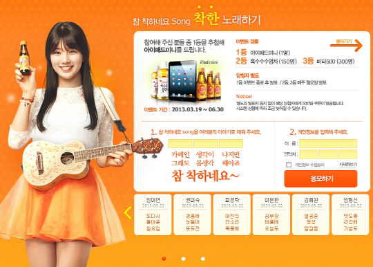 비타500의 새로운 모델로 수지를 선정하고 캠페인송인 '참 착하네요 song'을 발표한 광동제약이 착한 노래하기 이벤트를 진행하고 있다.