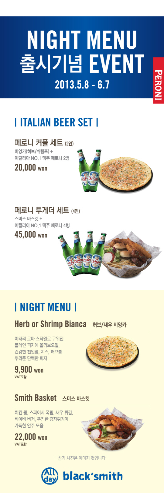 블랙스미스는 이번 이탈리안 스타일 나이트 메뉴 출시에 맞춰 이탈리아 No.1 수퍼 프리미엄 맥주 '페로니 나스트라즈로(Peroni Nastro Azzurro, 이하 페로니)'와 함께 이탈리아식 저녁의 정취를 느낄 수 있도록 특별한 기회도 마련하였다. 이탈리아 고유의 재료와 독특한 공법으로 제조되는 프리미엄 맥주인 페로니는 국내에 2011년 5월 최초로 소개되어 고급 이탈리안 레스토랑, 백화점, 프리미엄 모던 바&라운지에서만 만날 수 있던 맥주. 블랙스미스는 허브 비앙카 또는 쉬림프 비앙카와 페로니 2병으로 구성 된 2인용 '페로니 커플 세트'와 스미스 바스켓과 페로니 4병으로 구성되는 4인용 '페로니 투게더 세트'를 출시하여 각각 20% 할인된 2만원, 4만5천원에 판매한다. (VAT 포함 가격). 퇴근 후 직장 동료들과, 오랜만에 만난 친구들과 지인들, 그리고 가족들과 함께 시원한 여름 밤을 선사할 것으로 기대하고 있다.