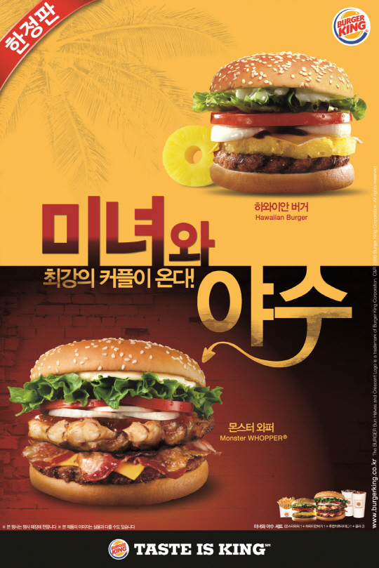 버거킹(대표 정권수, ㈜비케이알)이 '하와이안 버거'와 '몬스터 와퍼'를 함께 맛볼 수 있는 '미녀와 야수세트(가격 14,000원)'를 출시한다.
