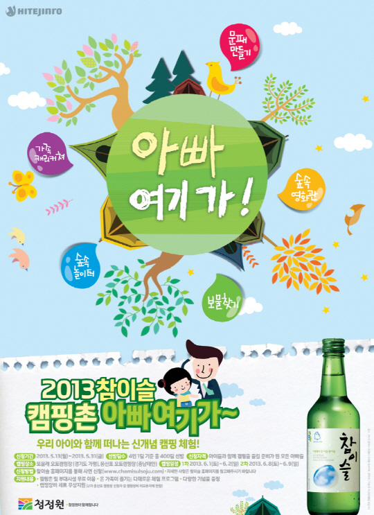 가족단위 고객들을 대상으로 진행되는 이번 캠핑촌 이벤트는 4인 1팀 기준으로 총 400팀을 선발하며, 1차 100팀, 2차 300팀에게 캠핑 참가의 기회가 주어진다. 신청은 5월 13일부터 5월 31일까지 하이트진로 홈페이지(www.hitejinro.com)와 참이슬 홈페이지(www.chamisulsoju.com)를 통해 가능하다. 캠핑에 참여해야 하는 이유 등 사연을 적고, 참가하고 싶은 차수 및 캠핑 장소를 선택하면 된다.
