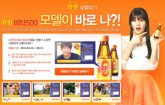 '착한 모델되기' 이벤트에 참여하기 위해서는 비타500 브랜드 페이지(www.vita500.com)에 접속해 비타500 모델이 될 사진을 올리고 착한 메시지를 입력하면 된다.
