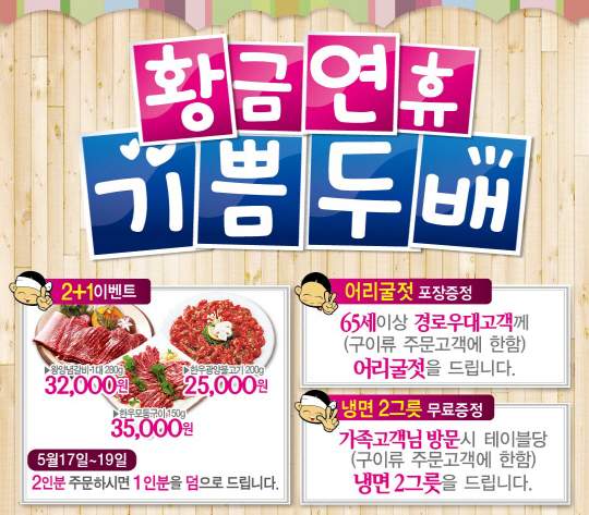 한식전문점 '강강술래' 역삼점은 오는 17~19일까지 왕양념갈비를, 서초점과 여의도점은 한우광양불고기·왕양념갈비·한우모둠구이 메뉴를 2인분 시키면 1인분을 추가 증정한다. 서초점은 가족고객 방문시 테이블당 냉면 2그릇을 제공하며, 65세 이상 고객에겐 어리굴젓을 증정한다.