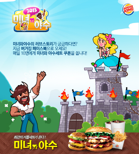 버거킹(대표 정권수, ㈜비케이알)이 '미녀와 야수세트' 출시를 기념하여 페이스북 이벤트를 진행한다. 버거킹 페이스북 내 게임을 통해 진행되는 이번 이벤트는 성에 갇힌 미녀(야수)를 구하기 위해 가위바위보를 해서 계단을 올라간다는 내용으로 매일 게임 상위 랭커 10명(야수 5명, 미녀 5명)을 선정하여 '미녀와 야수세트'를 증정한다.