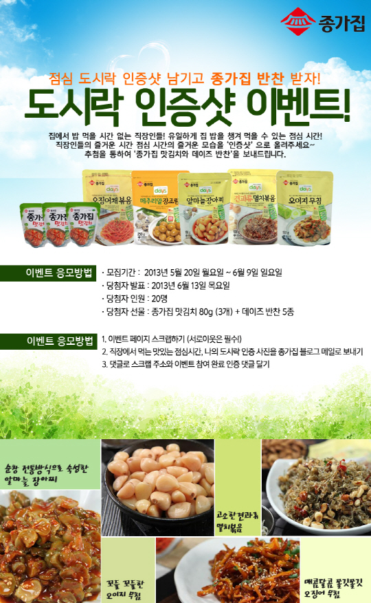 이번 이벤트는 물가상승과 계속되는 불황에 점점 늘고 있는 직장인 도시락족을 위해 마련한 것으로, 직장에서 먹는 도시락 사진을 찍어 종가집 블로그 메일(chefzzong_@naver.com)로 보낸 후, 블로그 이벤트 페이지에 참여 완료 댓글을 남기면 응모할 수 있다.