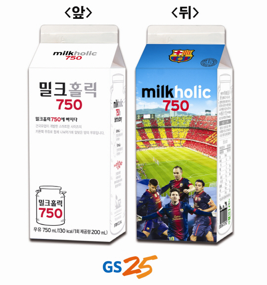 GS25는 국내에는 750ml 용량의 흰우유 용기를 생산하는 업체가 없어 대만에서 종이팩을 수입했을 뿐 아니라, 용기의 한 쪽 면에는 바르셀로나 선수들의 이미지를, 다른 쪽 면에는 밀크홀릭 로고를 넣어 양면의 디자인이 다른 fun한 요소를 가미하는 등 지금까지 없었던 창조적인 혁신을 시도하며 이번 상품을 개발했다.