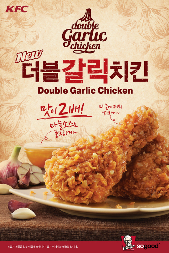 KFC(http://www.kfckorea.com)는 풍부한 마늘 맛으로 직장인들의 스트레스를 단번에 날려줄 '더블갈릭치킨'을 출시했다.