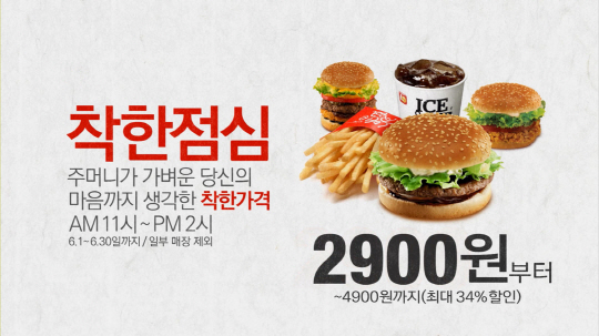 롯데리아의 '착한점심' 프로모션은 인기세트 메뉴를 기존 런치타임으로 운영 되던 11시부터 오후 2시까지 최대 34%까지 할인된 착한 가격에 제공하는 프로모션이다.