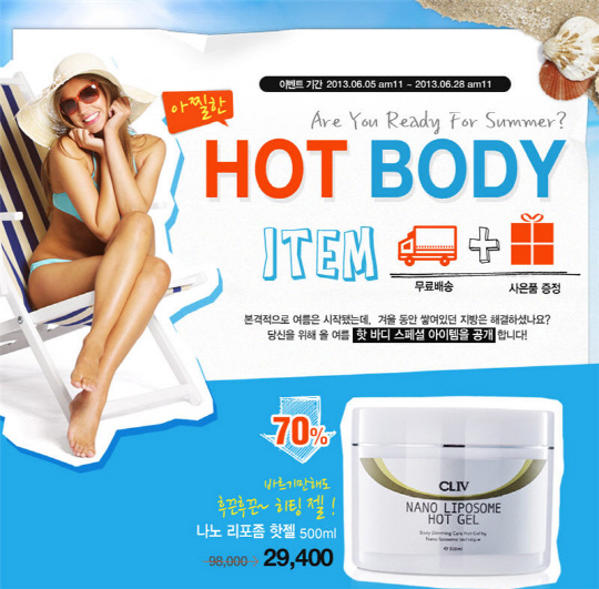 CL4 공식 쇼핑몰은 'CL4(씨엘포)가 준비한 HOT 바디 아이템을 통해 매끈하고 화끈한 바디라인을 완성하여 시원한 여름을 보내자'라는 주제로 CL4(씨엘포)의 인기 바디 제품 할인 행사 및 1+1 정품 증정 이벤트를 실시한다.