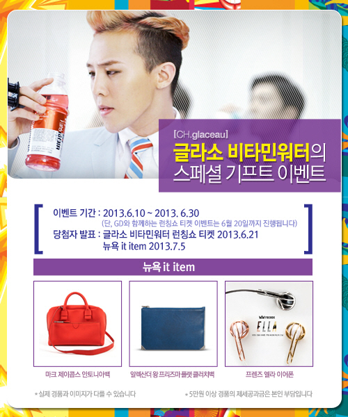 20일까지 '유튜브 채널 글라소'에서 GD의 스페셜 영상을 감상한소비자 중 추첨을 통한 500명에게는 지드래곤을 만날 수 있는 '글라소 비타민워터 런칭쇼' 티켓이 주어지며, 이달 30일까지 이벤트에 참가한 소비자 중 6명에게는 '마크제이콥스 안토니아백(1명)', '알렉산더 왕 프리즈마 플랫 클러치백'(2명), '프렌즈 엘라 이어폰'(3명)이증정된다. 당첨자 발표 및 자세한 사항은 유튜브 채널 글라소 페이지를 참조하면 된다.