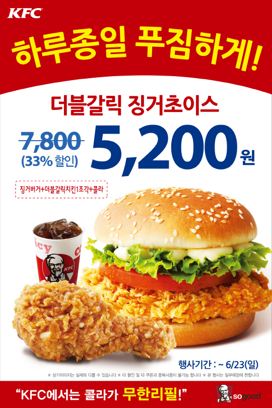 KFC 마케팅 담당자는 "기존에는 런치타임(오전 11시~오후 2시)에만 할인을 적용해 5,900원에 제공했으나, 고객들의 반응이 뜨거워 하루종일 5.200원으로 할인된 가격에 제공하게 됐다"며 "실속있는 가격에 든든한 한 끼 식사를 해결할 수 있어 더욱 많은 고객들의 호응이 기대된다"고 말했다. [소비자인사이트/스포츠조선] 송진현 기자 jhsong@sportschosun.com