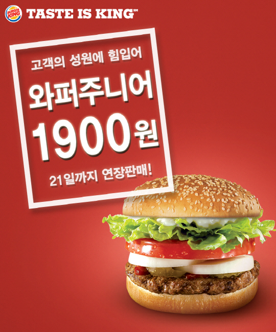 버거킹(대표 유주열, ㈜비케이알)이 와퍼주니어 단품을 기존 3,500원에서 1,900원으로 할인 판매하는 프로모션을 연장한다. 예년보다 일찍 찾아온 더위에 지친 고객들을 위해 기획된 본 프로모션은 6월 17일부터 19일까지 삼일간 진행될 예정이었으나 고객들의 뜨거운 성원에 힘입어 6월 21일까지 연장 실시하기로 결정했다.