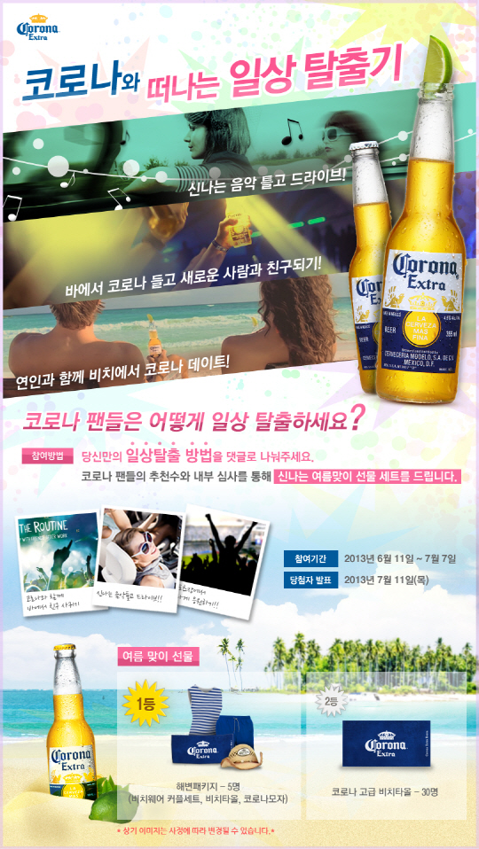 코로나 공식 페이스북(www.facebook.com/CoronaExtraKorea)에 자신만의 일상 탈출 방법을 댓글로 남기면 누구나 참여할 수 있으며, 추첨을 통해 총 35명에게 다양한 여름 맞이 선물을 증정한다. 코로나 페이스북 팬이라면 당첨 확률이 더욱 높아진다. 이벤트는 7월 7일까지 진행되며7월 11일 페이스북을 통해 당첨자를 발표한다.