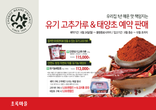 유기 친환경 식품 전문 초록마을(대표이사 박용주)이 '유기농 태양초 & 고춧가루' 예약판매 행사를 실시해 인기다.