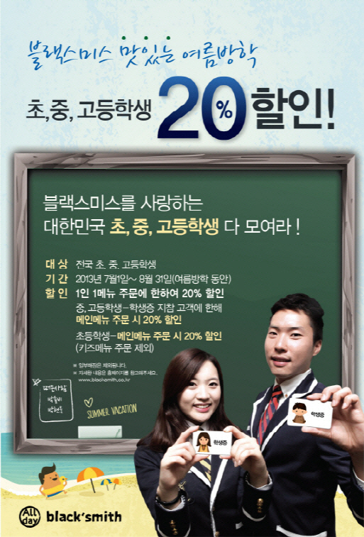 블랙스미스는 7월 1일부터 8월 31일까지 전국의 초·중·고등학생을 대상으로 청소년 할인 이벤트인 '맛있는 여름방학'을 실시한다고 밝혔다. 블랙스미스의 맛있는 여름방학 이벤트는 1인 1메뉴 주문 시 중·고등학교 학생증 지참 고객에 한해 메인 메뉴 가격의 20%를 할인해주고, 초등학생은 키즈메뉴를 제외한 메인 메뉴 주문 시 20% 할인이 적용되는 가격 혜택 프로모션이다.