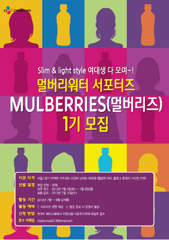 CJ제일제당 '뽕잎수'는 오는 8일까지 다이어트와 뷰티에 관심이 많고 블로그나 SNS 활동이 활발한 서울 및 수도권 소재 여대생을 대상으로 뽕잎수 서포터즈 '멀버리즈 1기'를 모집한다.