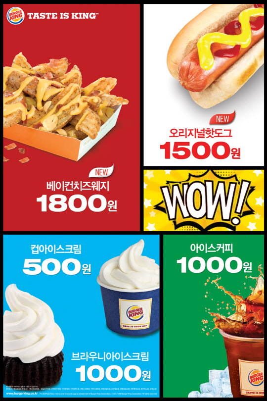 'WOW 시리즈'는 프로모션 진행 기간 동안 시간 제약 없이 '컵 아이스크림' 500원, 부드러운 소프트아이스크림이 올려진 달콤한 '브라우니 아이스크림'과 시원한 '아이스커피' 각각 1,000원, '오리지날 핫도그' 1500원, '베이컨치즈웨지'를 1,800원의 합리적인 가격으로 맛 볼 수 있다. 'WOW 시리즈'를 통해 첫 출시되는 '베이컨치즈웨지'는 기존 버거킹 '갈릭치즈웨지감자'에 바삭하고 고소한 베이컨이 곁들어져 한층 더 담백한 맛을 자랑한다.