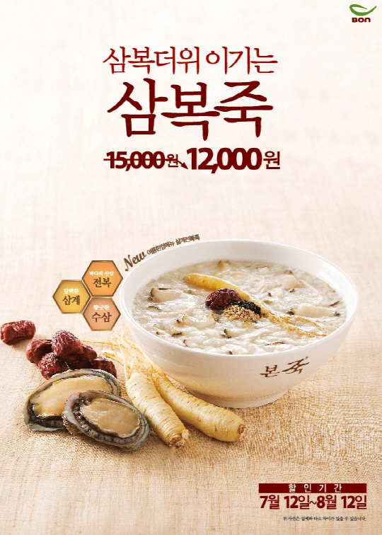본죽은 무더운 여름철 체력 보충을 원하는 고객을 위해 위해 8월 12일 까지 '삼복죽' 할인 이벤트를 진행한다. 이에 기존 15,000원에 판매 되던 삼복죽을 이벤트 기간 동안 12,000원에 만나볼 수 있다.
