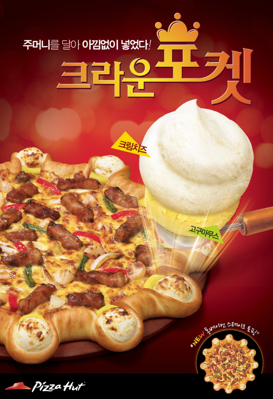 한국 피자헛은 도우 끝에 주머니를 달아놓은 모양의 신제품 '크라운 포켓' 피자를 출시해 인기를 모으고 있다. 크라운 포켓 피자는 재료를 많이 담기 위해 동그란 주머니를 달았다는 아이디어가 돋보이는 메뉴로, 고구마 무스와 크림치즈로 꽉 채워진 왕관 모양이 시각적인 재미를 선사하며 소비자 시선을 사로잡았다. 특히 독특한 모양만큼 크림치즈를 피자 끝까지 바르거나, 토핑을 크림치즈에 찍어먹는 등 다양한 방법으로 즐길 수 있는 것이 특징이다. '크라운 포켓' 피자는 두툼한 베이컨 스테이크와 구운 마늘 토핑과 상큼한 사과퓨레가 어우러져 식감과 풍미를 살린 통베이컨 스테이크를 비롯한 6가지 토핑으로 구성됐다.