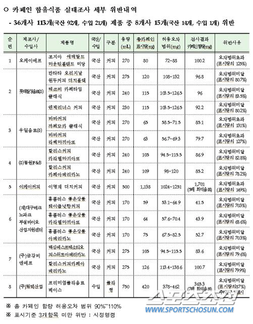 카페인 함유식품 실태조사 세부 위반내역. 자료출처=식약처