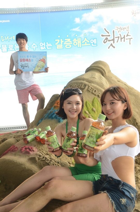 이날 행사장은 도심 속 해변피서지로 연출된 백사장 위에 대형 컨디션 헛개수 모래 조각을 설치, 시민들에게 폭염 속 시원한 즐거움을안겨준다.