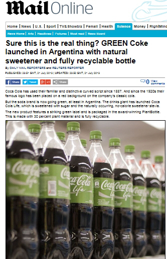 영국매체 데일리메일은 코카콜라가 최근 아르헨티나에서 녹색 라벨의 신제품 '코카콜라 라이프'를 내놨다고 21일(현지시간) 보도했다.