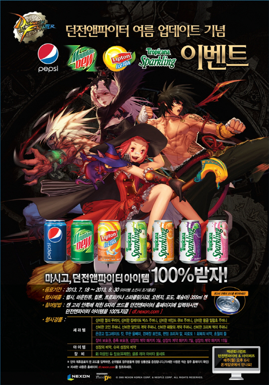 롯데칠성음료(대표이사 이재혁)는 9월 30일까지 펩시, 마운틴듀 등 음료 구매시 인기 온라인게임 '던전앤파이터' 아이템을 100% 증정하는 이벤트를 실시한다.