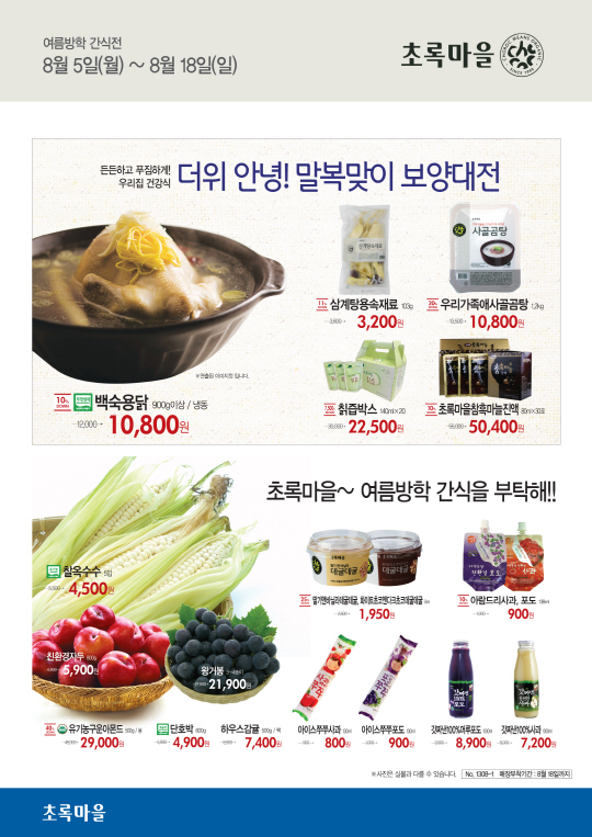 감사 행사는 가족 보양식으로 꾸린 백숙용닭을 비롯해 우리가족애사골곰탕, 초록마을 참흑마늘진액 등 말복에 맞춘 영양만점 '더위안녕! 말복맞이 보양대전'과 여름방학을 한 아이들 간식으로 꾸린 찰옥수수, 음료, 아이스크림, 친환경 자두 등 '여름방학 간식을 부탁해'로 마련했다. 8월 5일부터 8월 18일까지 총 10일간 최대 40%까지 할인된 가격에 만날 수 있다