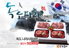 먼저 온라인쇼핑몰(www.sullaimall.com)과 전화주문(080-925-9292)을 통해 이달 18일까지 한우불고기(500g·2팩)와 한돈양념구이(500g·2팩)로 구성된 '독도사랑' 세트를 30% 할인된 5만원에 판매한다.