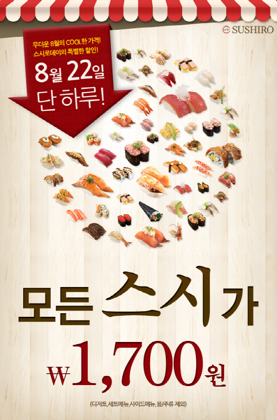 이번 8월 스시로데이는 메뉴에 상관없이 스시 한 접시당 무조건 1,700원에 판매하며, 땡큐베리장어 프로모션 메뉴를 포함한 100여가지의 다양한 이색스시를 모두 균일가에 맛볼 수 있다. 스시로데이 균일가 프로모션은 종로, 신사, 목동, 발산, 인천, 연수, 울산 삼산점까지 총 6개의 영업장에서 동시 실시된다.