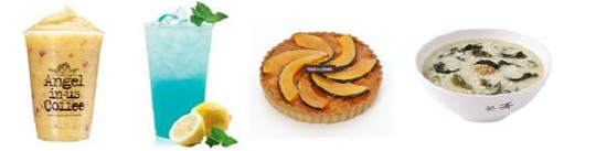 원재료의 맛을 살린 제품들이 각광을 받고 있다.. 왼쪽부터 엔제리너스커피 '사과 스무디', 망고식스 '블루레몬에이드',뚜레쥬르 '순호박 찰떡 브레드', 본죽 '자연나물죽'