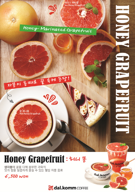 커피프랜차이즈 전문 ㈜달콤의 '커피와 음악' 컨셉의 '달.콤커피'(dal.komm COFFEE, www.dalkomm.com)가 신선한 과육을 그대로 사용해 달콤쌉싸름한 맛을 자랑하는 자몽 음료 '허니몽'을 새롭게 선보였다.