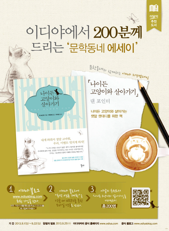 커피 전문 기업 이디야 커피(대표이사 문창기)는 나이든 고양이를 기르는 캣맘과 캣대디가 알아야 할 정보를 담은 실용 에세이 '나이든 고양이와 살아가기'를 200명에게 무료로 증정하는 이벤트를 오는 9월22일까지 진행한다.